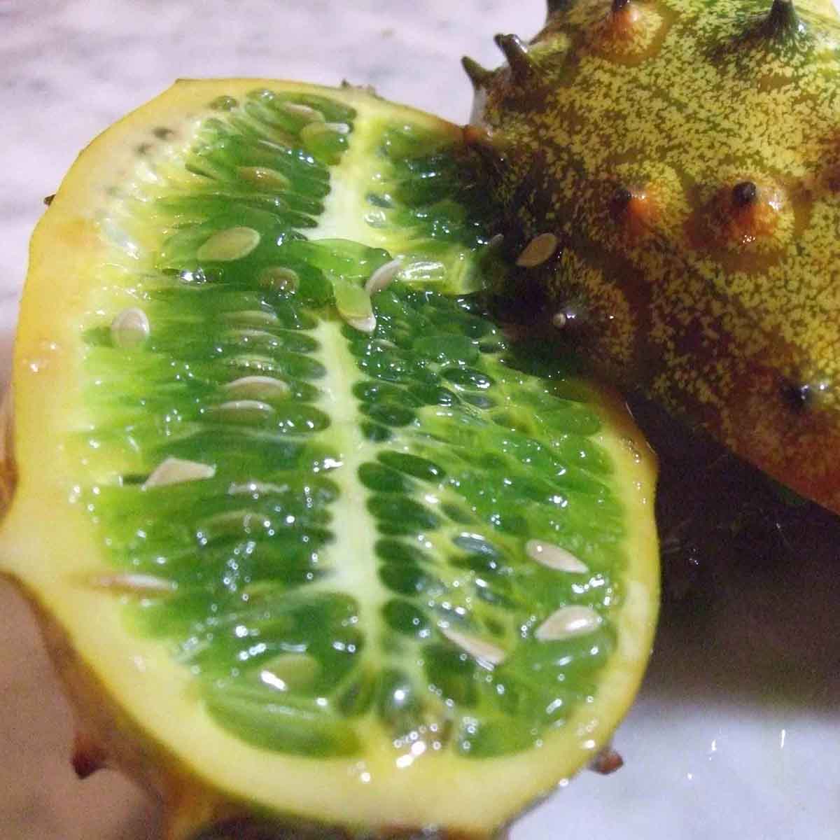 Castravetele Kiwano (Cucumis metuliferus), cunoscut și sub numele de „pepene cu coarne”, este o plantă exotică, originară din Africa, care se remarcă prin fructele sale spectaculoase, cu coajă portocalie acoperită de țepi moi și miez verde-gelatinos. Este ideal pentru grădinarii pasionați de plante inedite. Fructele sale au un gust subtil, care combină aromele de castravete, kiwi și lime, fiind ideale pentru consum proaspăt sau în deserturi.